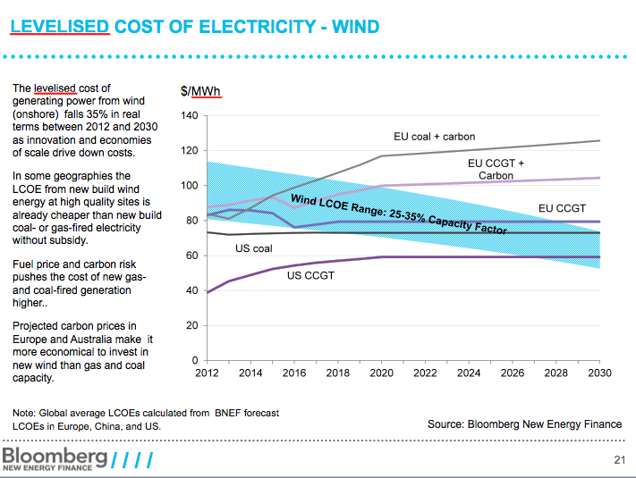 But BNEF chief executive Michael Liebreich says that, in the battle between overcapacity (as well as competition from cheap shale gas) and the falling costs of renewables and associated clean technologies, “falling costs win.”