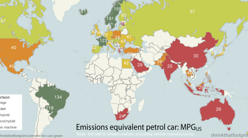 In coal heavy India, China, Australia and South Africa electric cars using grid power are just like typical gasoline vehicles, in the 25-30 MPGUS range. In the UK, Germany, Japan and Italy they are as good as the best petrol hybrids, in the 45-50 MPGUS range. But in low carbon supply places like France, Brazil, Switzerland and Norway they are in a different league, averaging well beyond 100 MPGUS for equivalent emissions.