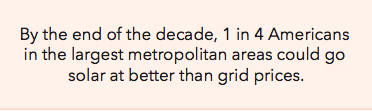 In the short-term, Southern California reaches grid parity with moderately high electricity prices and excellent sunshine, with New York coming soon after due to particularly high grid prices. By the end of the decade, 1 in 4 Americans in the largest metropolitan areas could go solar at better than grid prices.