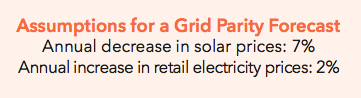 To determine when cities reach residential solar grid parity, we assumed that electricity prices would continue to rise at 2% per year (the historical average9) and that the cost of solar would decline at 7% per year (less than the 5-year average of 10%).