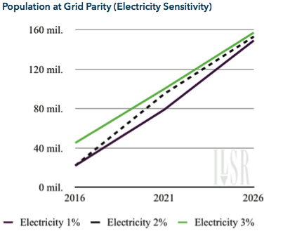 Electricity prices are relatively stable, so the small range tested in the sensitivity analysis also has a relatively small impact on the eventual coming of grid parity (see adjacent chart).