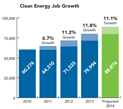 Renewable energy came in a close second to efficiency, employing 30,537 workers at 2,312 companies with a 2.6% growth rate. This area of the clean energy economy definitely cooled off compared to 2011-2012, when it grew 26%, and is surprising considering installed solar capacity grew from 16 megawatts (MW) in 2009 to over 250MW in 2012, and now represents 8,400 workers for 59.7% of all renewable energy jobs.