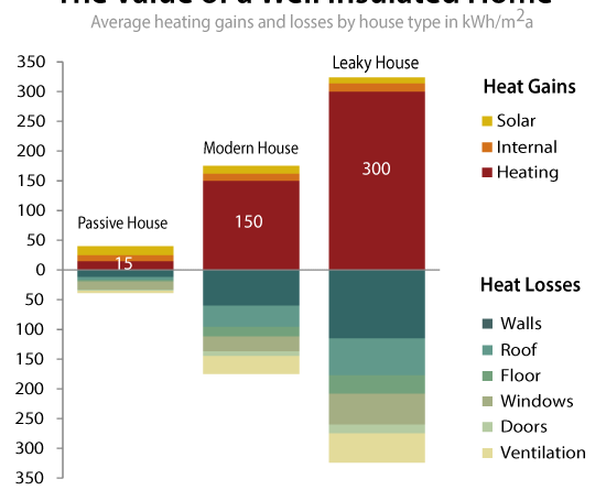 In the image above, we depict the heat gains and losses for a ‘leaky house’, a ‘modern house’, and a ‘passive house’. While it is tempting to look at heat gains first, it is actually the losses that explain what is going on.