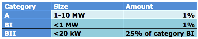 Under S.B. 1189, larger utilities (those who serve 100,000+ customers — effectively, SCE&G and Duke Power) must obtain 2% of their average 5-year peak power demand from solar energy sources. Of this 2%, 1% must be comprised of 1-10 MW solar projects; the other 1% must be comprised of solar projects under 1 MW, 25% of which must be 20 kW or smaller. Here’s the breakdown of that 2%: