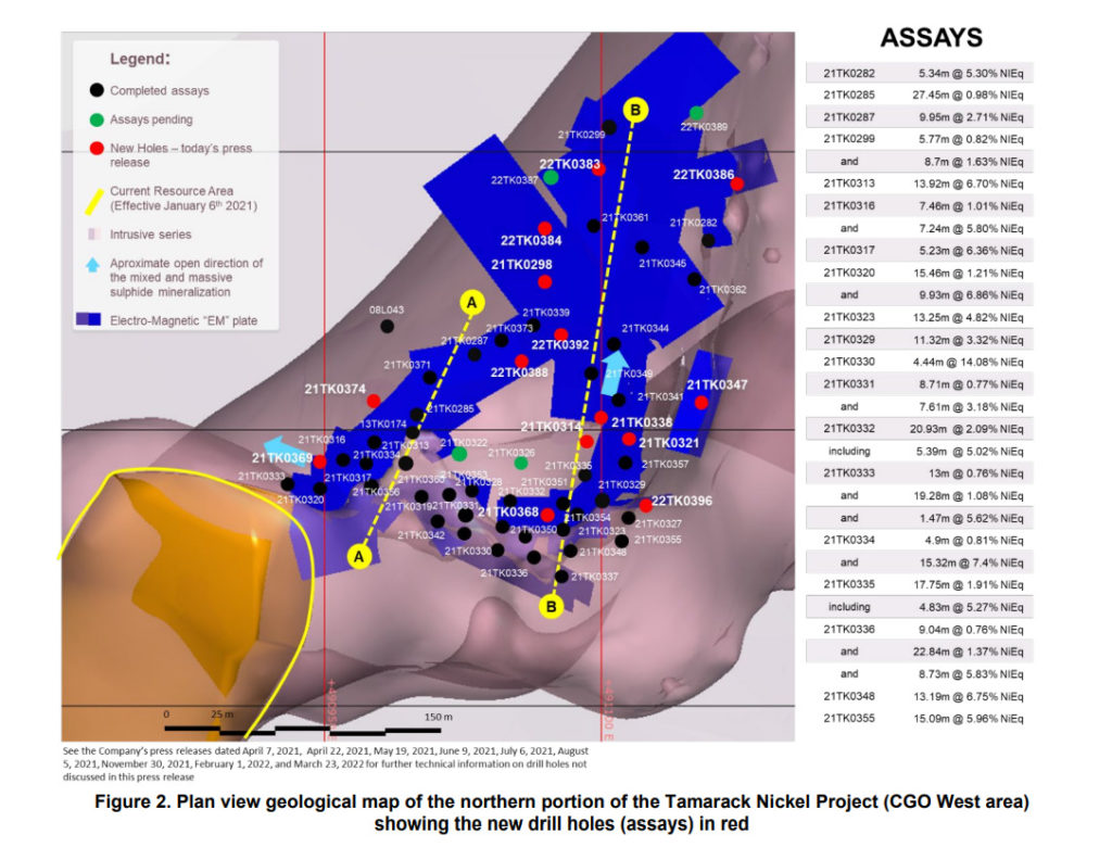 “Today’s announcement demonstrates that we continue to find more thick, high-grade nickel-copper mineralization in the CGO West area, which is located outside of the Tamarack Nickel Project’s defined resource area. More specifically, drill hole 21TK0369 contains an extremely thick 29.39 meter interval grading 1.71% Ni (2.21% NiEq). This represents one of the thickest intercepts encountered in the CGO West area to date. The fact that this hole is located on the western edge of the CGO West area highlights that CGO West continues to be open to the west. While we had intended to be finished drilling in the CGO West area by now, the high-grade nickel-copper mineralization just seems to keep going; therefore, we feel it is prudent to continue drilling within the CGO West area to further expand our resource,” said Brian Goldner, Talon Metals, Chief Exploration Officer.