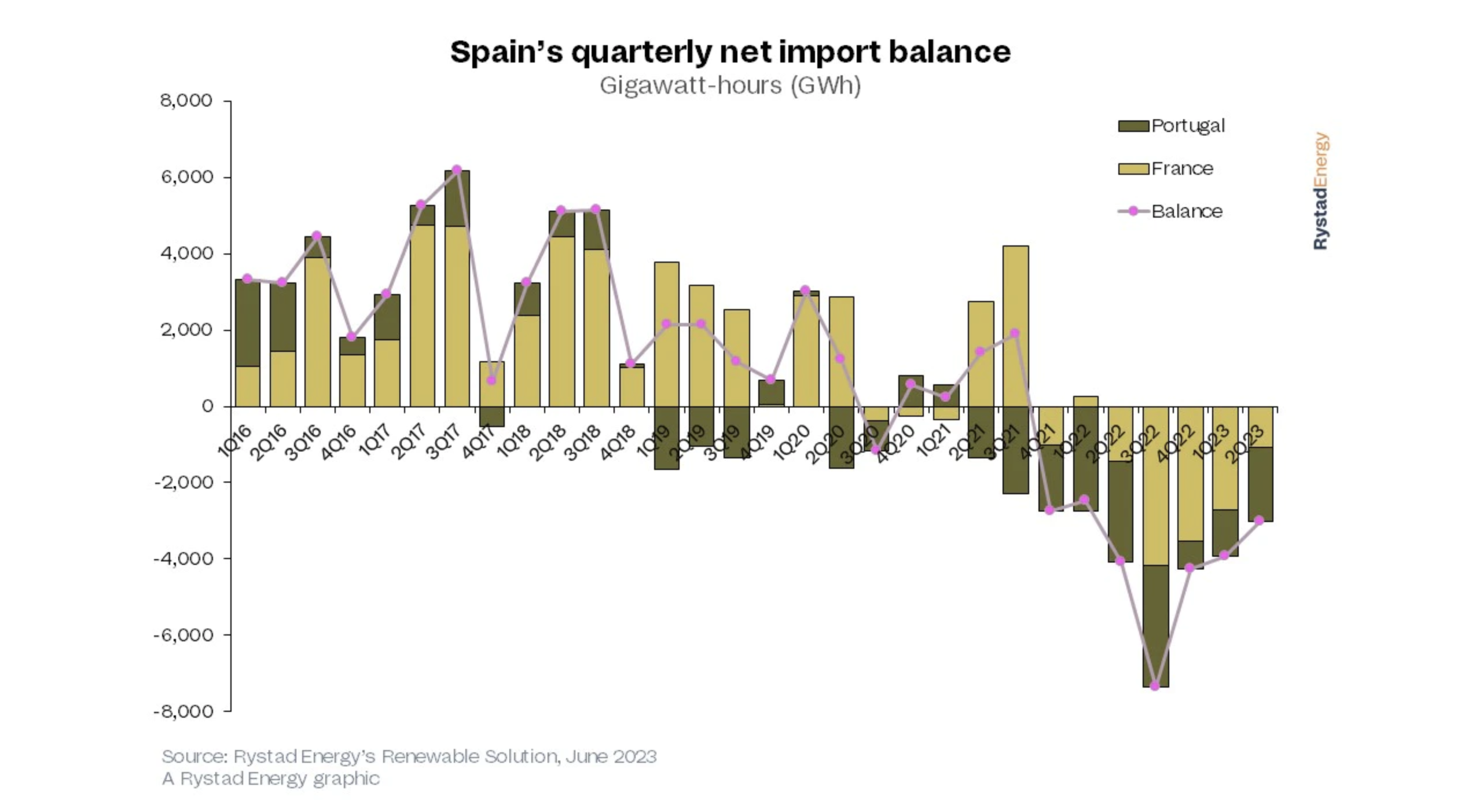 “Spain’s prices have been significantly lower than France’s this year. Average power prices in France have been 34% higher than those in Spain, owing to various factors, including Spain’s transition from being one of Europe’s highest-priced spot markets to one of its lowest. Even when accounting for the effects of market intervention measures in 2022, the price disparity between Spain and France remains vast.”