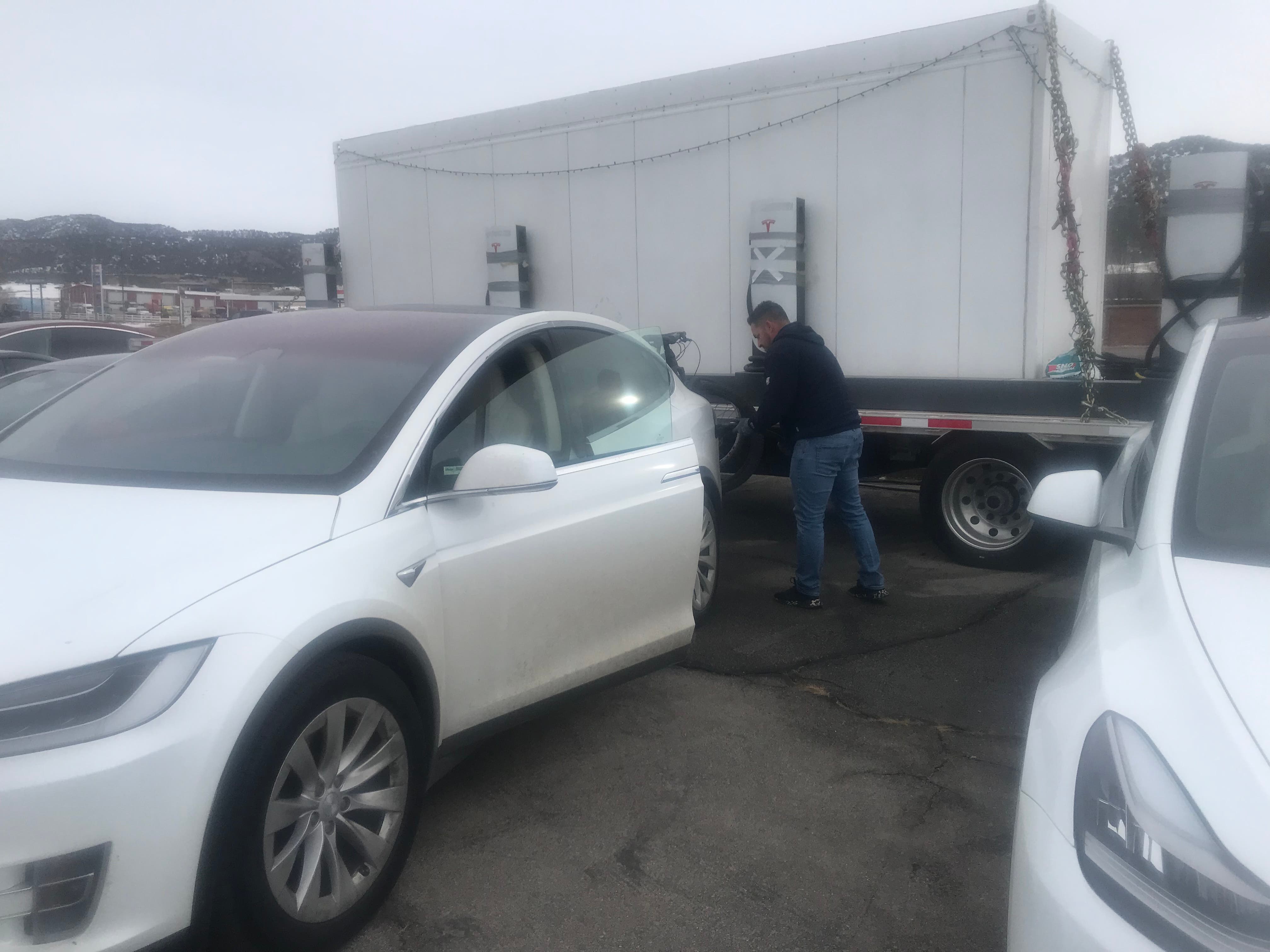 That left the also sleepy 8-stall 150 kW slow Supercharger in Nephi 90 miles south of SLC that has always been packed. Apparently, Tesla anticipated the big post-Christmas travel surge on December 26, 2022, but hadn’t been able to install new permanent stalls yet. As we drove in, we observed a big semi-truck trailer with a huge box on it and a man standing next to it. We backed up to the trailer. The man, who turned out to be a Tesla employee, plugged in my daughter’s Model X (see picture below). There were 5 additional 250 kW cables running from the trailer. In the meantime, Tesla has added another 8 permanent 250 kW non-shared stalls. That makes 16 stalls now at Nephi.