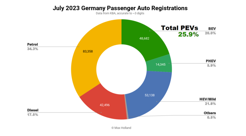 July saw plugin EVs take 26% share in Germany, up from 25.5% year on year. Behind the apparently scant growth, full electrics grew market share by 1.43× to 20.0%, whereas plugin hybrids lost share. Overall auto volume was 243,277 units, up by 18% year on year, though still below long-term seasonal norms (over 300,000). The Volkswagen ID.4/5 was the bestselling full electric, and the BMW i5 made its market debut.