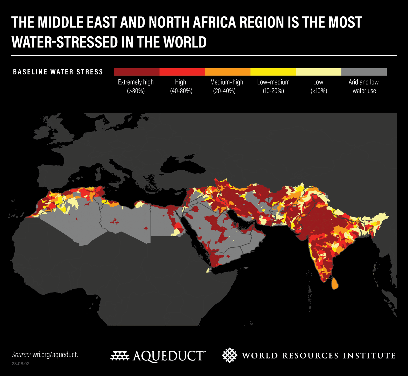 The most water-stressed regions are the Middle East and North Africa, where 83% of the population is exposed to extremely high water stress, and South Asia, where 74% is exposed.