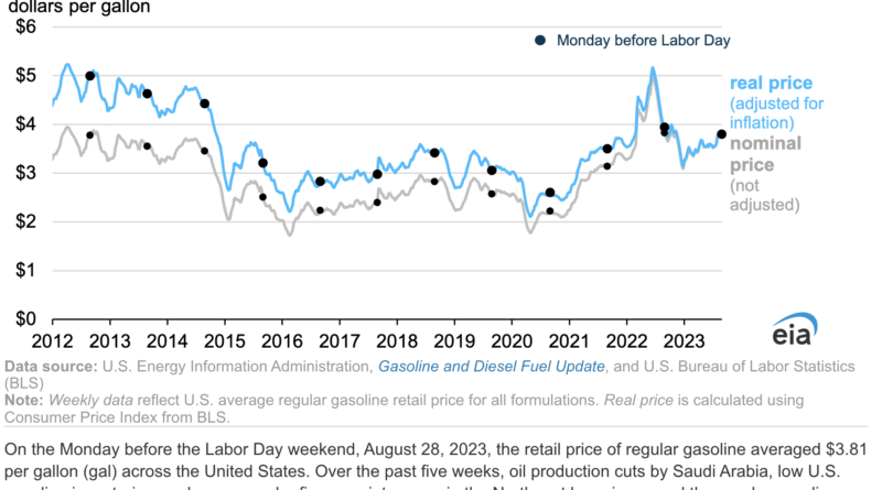 On the Monday before the Labor Day weekend, August 28, 2023, the retail price of regular gasoline averaged $3.81 per gallon (gal) across the United States. Over the past five weeks, oil production cuts by Saudi Arabia, low U.S. gasoline inventories, and announced refinery maintenance in the Northeast have increased the regular gasoline retail price by 6%, or 22 cents/gal.