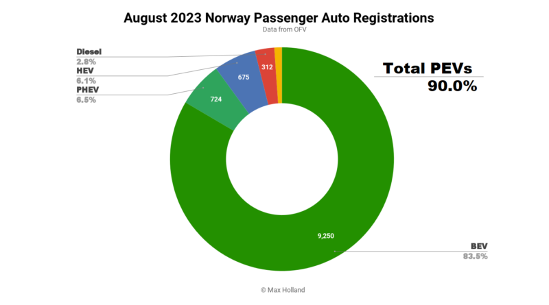 August saw combined EVs at 90% share in Norway, comprising 83.5% full electrics (BEVs), and 6.5% plugin hybrids (PHEVs). These compare with YoY figures of 86.1%, 74.9%, and 11.3%, respectively. We can see that BEVs have gained almost another 10% of the market in the past 12 months, and PHEVs are in decline, along with all other non-BEV powertrains.