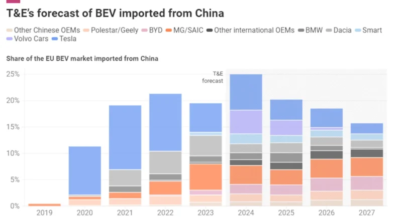Given these initial trends and the expected sales by GlobalData, T&E has updated its China-made BEV imports forecast to 2027.