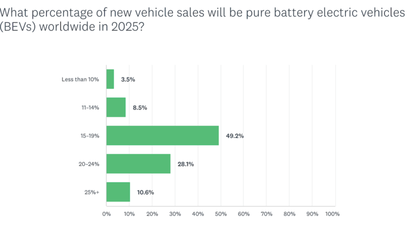 So, this year, 49% of you think BEV market share will reach 15–19% this year. As a reminder, 14% of world auto sales were BEV sales last year, 10% were BEVs in 2023, 10% were BEVs in 2022, 6% were BEVs in 2021, and 4% were BEVs in 2020.