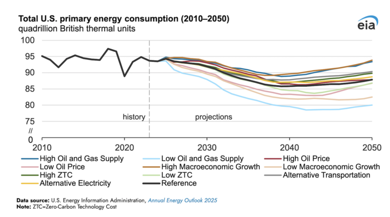 U.S. energy consumption decreases in the next several years before increasing again in the early 2040s through 2050, according to our recently published Annual Energy Outlook 2025 (AEO2025). U.S. energy consumption in 2050 is lower than in 2024 in most of the scenarios we explore in AEO2025, but the range of outcomes varies significantly based on the underlying assumptions.