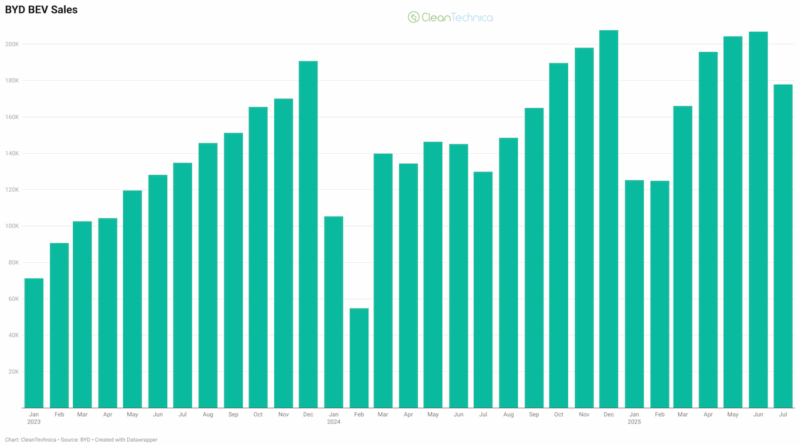 Looking at the figures for January–July, fully electric vehicle (BEV) sales were up 40.3%, while PHEV sales were also still up, by 14.8%. Overall, sales of BYD’s passenger vehicles were up an even 26%.