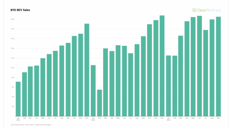 BYD didn’t have the best month last month, with its overall passenger car sales down 5.9% in the month year over year. That was its first monthly decline in quite a while. Though, the good news is that the company’s full electric vehicle (BEV) sales did rise. They were up 24.3% year over year in August. Below are charts (static and interactive) on these two topics before we move on to another.