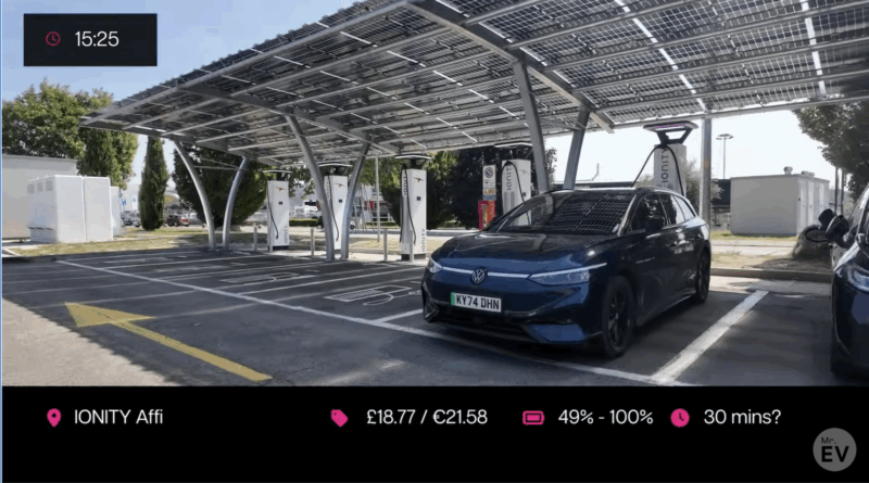 They leave from Sussex, England, and drive about 250 miles to a location where they charge at IONITY Novotel Saint-Witz. They stop to rest and have some food while charging.