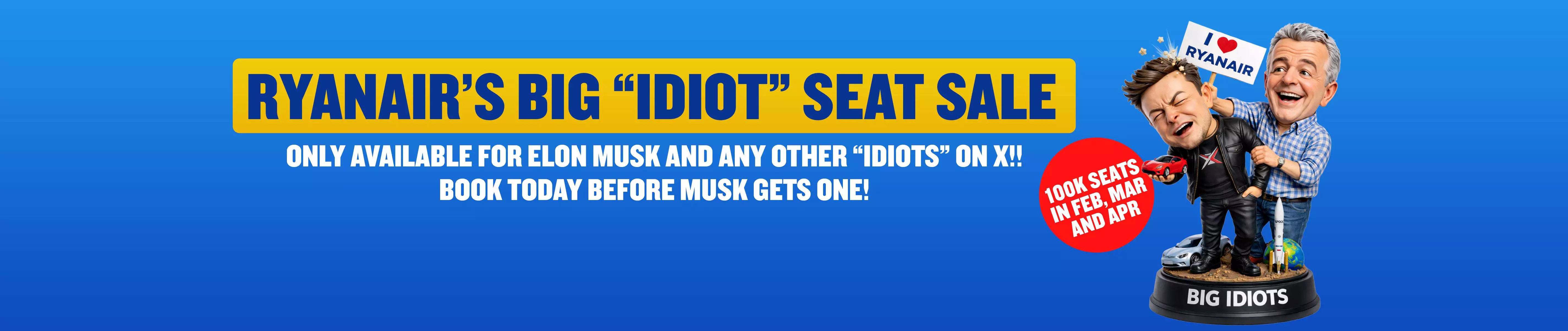 Of course, O’Leary has not responded in kind. Instead, he has responded by leveraging the entire exchange for publicity. On January 21, Ryanair announced a “Ryanair’s Big ‘Idiot’ Seat Sale” alongside a cartoon that shows O’Leary cutting in front of Musk to display an “I *heart* Ryanair” sign, with the following disclaimer (in all caps, of course):