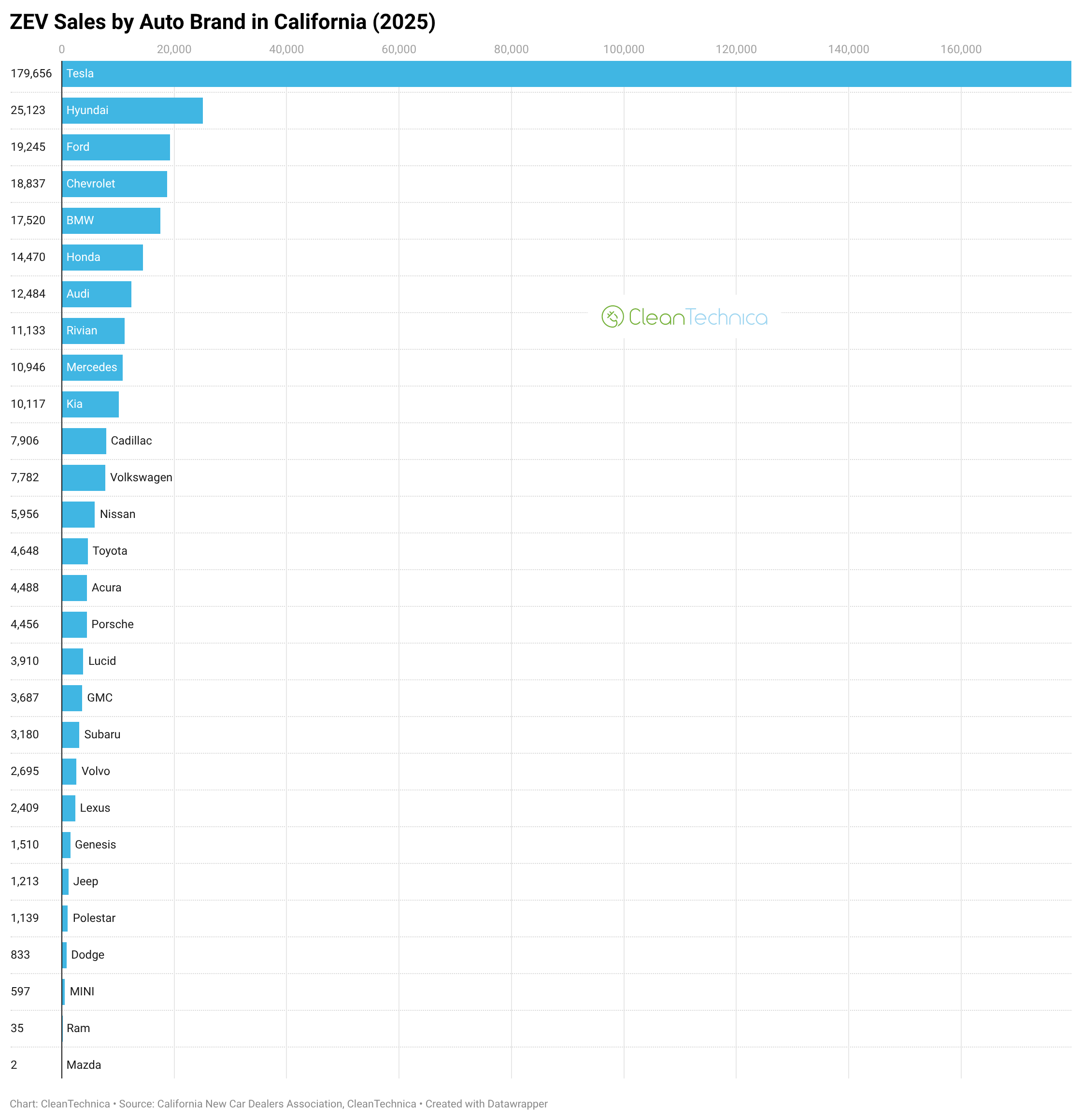 Tesla sold nearly 180,000 vehicles in California in 2025. The auto brand with the second highest EV sales was Hyundai, with 25,123. It’s not even close, not even close to close.